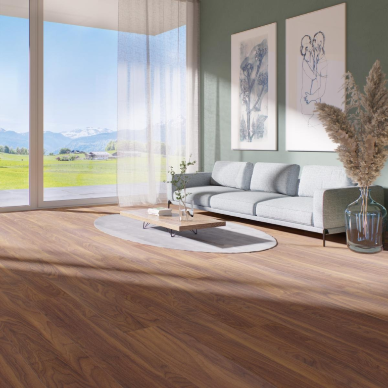 Kronoswiss Chrome D2562 nổi bật với sắc nâu óc chó ấm áp, gợi nên vẻ đẹp cổ điển pha lẫn sự sang trọng tinh tế cho không gian sống. Vân gỗ được xử lý dập nổi chân thực, kết hợp cùng rãnh chữ V ở cả bốn cạnh, tạo hiệu ứng thị giác như sàn gỗ nguyên khối liền mạch. Nhờ đó, sản phẩm mang lại cảm giác tự nhiên, gần gũi và êm ái trong từng bước di chuyển hằng ngày.